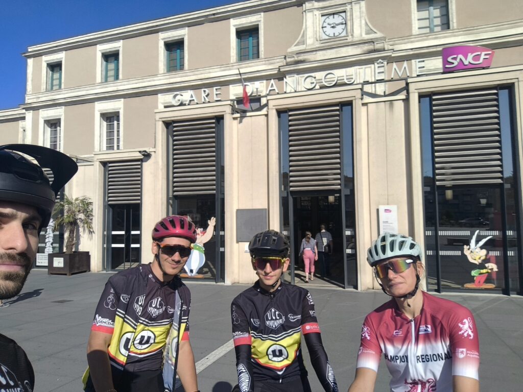 Pour une sortie qui fait du bien aux jambes, à l’image de l’aller-retour à La Rochelle lors de l’été dernier, Rayan BONNEAU COTTENEC, Evan BERGEON, Charles-Elie MONIER, complétés par Cécile SCOTTO, se sont donné rendez-vous à la gare de Vivonne. Sur le quai, les plaisanteries allaient bon train : « C’est de la triche de prendre le vélo dans le train ! Il faut pédaler ! » Mais les moqueries sympathiques des voyageurs se sont vite transformées en stupéfaction lorsque le groupe a expliqué qu’ils rentreraient le soir même, après une belle balade dans le parc régional du Périgord-Limousin, en partant d’Angoulême.
