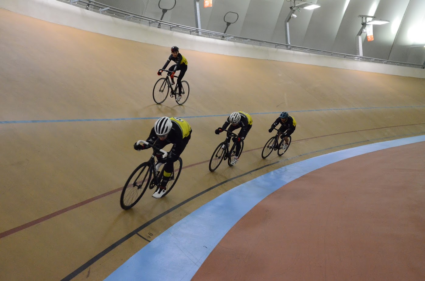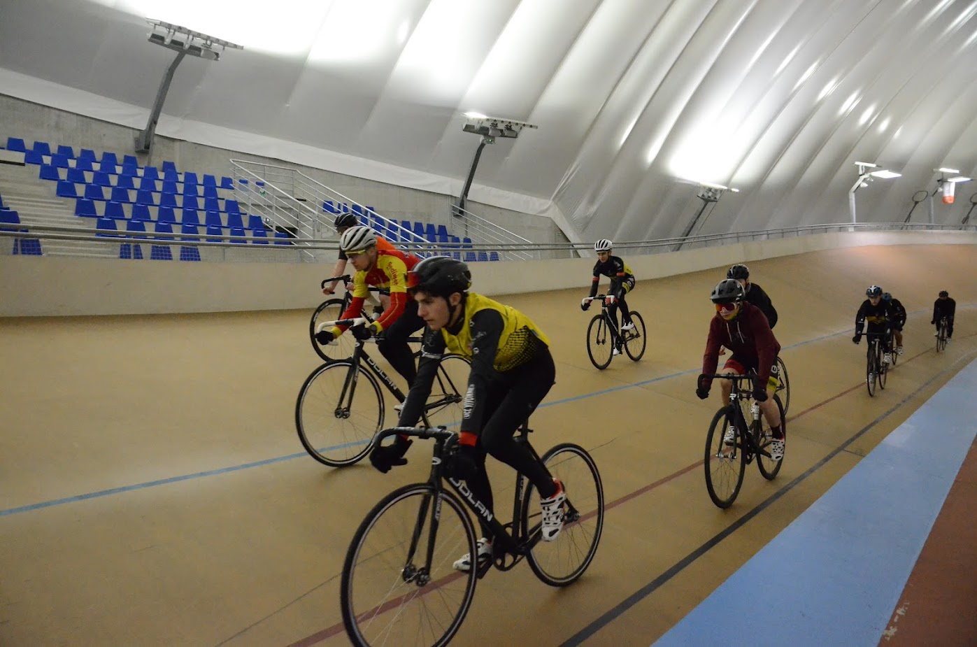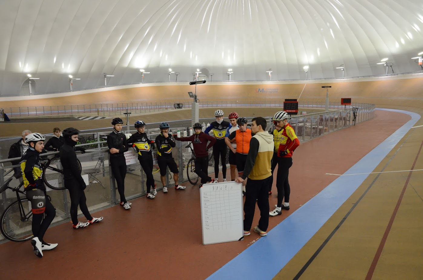 Échauffement de 30 minutes pour réactiver les automatismes du vélodrome. Puis début du travail spécifique.